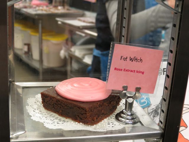When we’d finished eating, I tried to figure out how to get rid of Karen. It seemed like her fear of being alone was going to drive her to hang out with us all afternoon, even if she was unhappy and didn’t get to do the things she wanted (and made everyone else miserable in the process). Calvin and I exchanged desperate looks. We tootled around the market, hoping she would just leave if she thought we were doing boring things. I still didn’t want to have to be overtly mean to her, but gawd she was being a pain. We stopped by Fat Witch Brownies and I was delighted to find that today’s special creation (every couple of days they create something slightly interesting and different, and sell it from a little cabinet on the counter) was an original brownie covered in a swirl of pink rose-scented icing. I snarfed it down in about 3 joy-filled seconds. Chocolate and rose – genius combo.