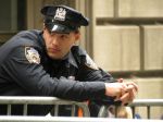 A bored NYPD officer looks on as people take their picture with the bronze bull on Wall Street,