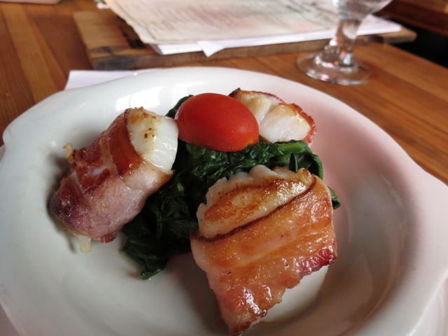 All this thought of drunken carousing and feasting on grouse with greasy fingers was making me hungry, and the wind screaming down the alleys wasn’t helping. Luckily, Calvin had the hungers too, and just as we were about to get desperate (neither of us had budgets that would stretch to the latest ‘it’ venue for food in this neck of the woods, and it was hard to find anywhere that wasn’t a historical building smothered in chrome or black silk, all signs of megabucks meals) we stumbled upon the Fraunces Tavern. This little gem turned out to be (allegedly) New York’s oldest building and tavern, and I would be inclined to believe it. You could almost FEEL the history, and the worn wood floors and old wooden beams in the roof screamed of ‘Ye Olde Yesteryear’. George Washington apparently downed a few drinks within its walls, so we knew we were in good company. Squatting near the corner of Pearl and Broad Street, the tavern is divided up into different sections, each for different drinking or eating purposes, plus a museum at the back; we entered through the very sophisticated-looking whisky lounge (if I remember correctly)… I fancied snuggling up in one of the dark, high-back leather chairs and sitting in the gloom with a glass of something strong and a cigar, but then I realised that I am NOT Donald Trump and that I don’t drink, so we moved onto the much more airy general bar and dining area, where the tables are made out of old sewing machine trestles and the seats are covered in animal hide. The menu was actually pretty reasonable, and made even more so by the fact that we had arrived during happy hour. For a measly $3 I got a bowl of deliciously crispy thick-cut chips, and for a few bucks more I got some scallops wrapped in bacon, sitting atop a pile of warm spinach. Calvin tried a sampler plate of burger sliders, all with different fillings, and we drank enough water to drown a small duck.