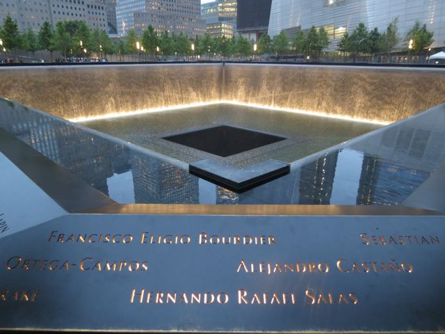 Anger management issues aside, the sun finally started to disappear about half an hour before the site was due to close. The lights came on, and wow, it was beautiful. The base of the fountains glowed warmly, and all around the edges the names of the lost burned brightly. In true darkness I’m sure they would have been even more outstanding, but as it was, it was still beautifully done, and a really nice tribute. My heart caught in my throat a little when I noticed the name of ‘Vanessa Lang Langer and her Unborn Child’ gleaming in the half-light; I’d never thought about the pregnant women of September 11th and the families they left behind who dealt with not only one loss, but two.