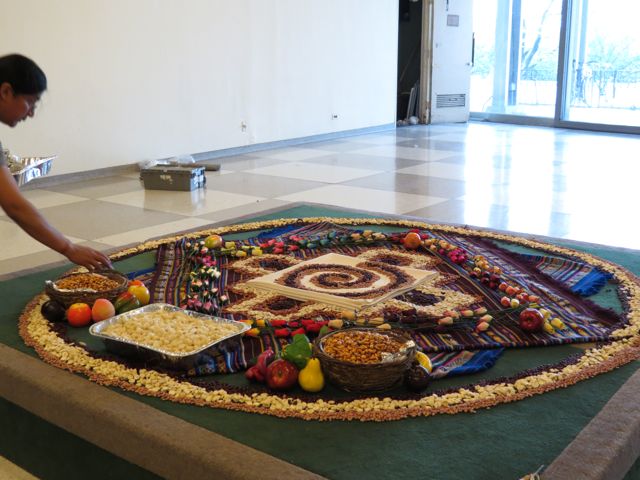 Anyway, we finished our tour and my head was buzzing with all the awesome ideas I’d just seen. It was raining outside and they were ushering people outside as fast as possible because the complex was closing. True to our sneaky style of the day, we spotted something being set up and wandered over to have a look, deaf to the calls of “Please leave the building now!” It turns out that those men from the Amazon that we encountered earlier were part of a larger delegation which had come to the UN for some sort of show and demonstration, and they were setting up a stage and a display of traditional food in a colourful pattern on a raised platform. FOOD! Both of us were starving. We must have looked pretty pitiful because one of the guys who was setting up ushered us over and asked us if we wanted to try some of what they were laying out. And – what a surprise – we DID want to try it! They had a few different types of mega-corn (the kernels were about 3 times the size of the corn I usually see), some of it roasted, some of it toasted (or maybe dried), and a baking tray full of soft mushy corn that was delicious. They also had beans, and we had a good go of everything before thanking our gracious host and scarpering before the security guards (who were already eyeing us suspiciously) realised we weren’t supposed to be there.