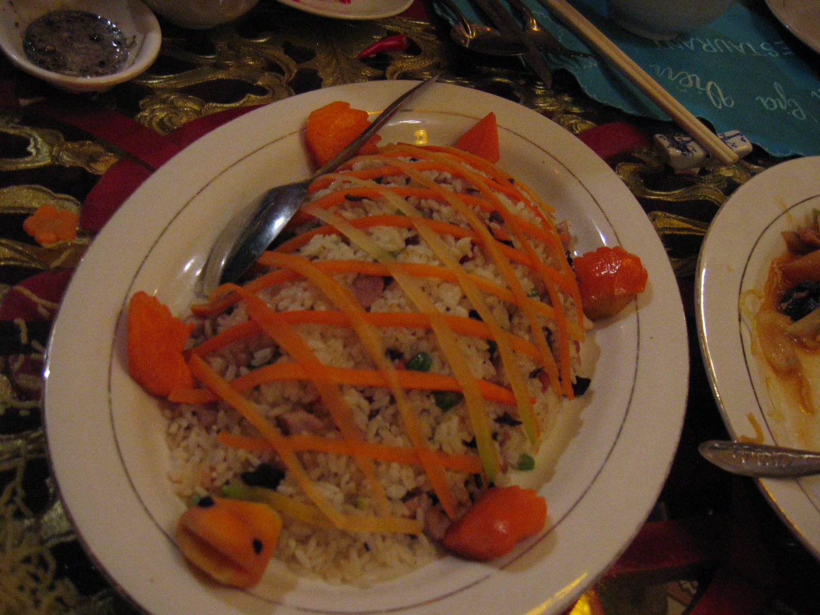 Recovering from the prawns, and at this point already feeling a bit stuffed, we moved onto the next course of dragon salad…! Then came the fish with a tomato sauce. Then came the beef stir-fry (surprisingly not done up to look like any sort of animal this time!). Just as we were about to explode like the fat guy in Monty Python, they brought out ANOTHER course of fried rice, shaped like a cute little turtle. Could we eat it? Well, we gave it a damned good try.