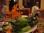 Finally, as a dessert, another dragon came out, this time filled with fresh green bananas and scooped-out pineapple. And with that, our gastronomic extravaganza overload came to an end. All in all, it cost us about $14 each, which for a feast of that size is remarkable. Was it the best food I’ve ever eaten? Hmmm… not really. I’ve had meals with more interesting flavours. BUT… was it the most beautiful meal I’ve ever eaten? Yes, yessiree. Just the sheer magic of having your food come out looking like a dragon that’s about to wriggle off your plate… brilliant. And the setting was fabulous.