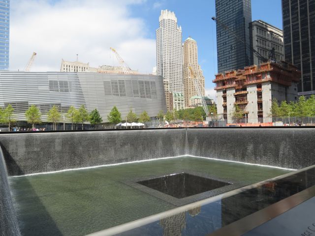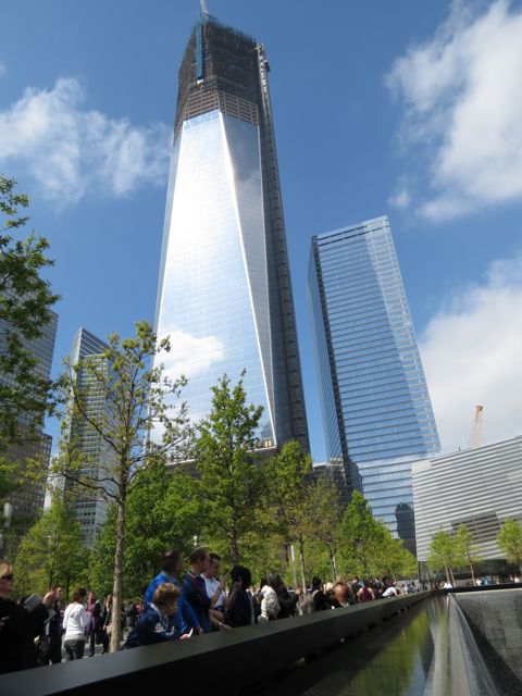 By this time, the sun had come out and it was actually warm. Charlie and I wandered around, fairly subdued, and watched the crowds react in different ways. People taking a moment of silence, families walking around looking for a particular name, and kids oblivious to that running around and playing. I don’t begrudge them that; their parents will fill them in when they’re old enough to understand. I tried to ignore a woman and her husband (by their accent, from California or somewhere West) posing and smiling by one of the tower footprints, and we just sat for a bit. Hard to imagine the horror in that tranquility, really; that’s probably a good thing. Happily, the ticket system seems to have kept the nutters out, and a large security presence also helps people remember how to be respectful… mostly!
